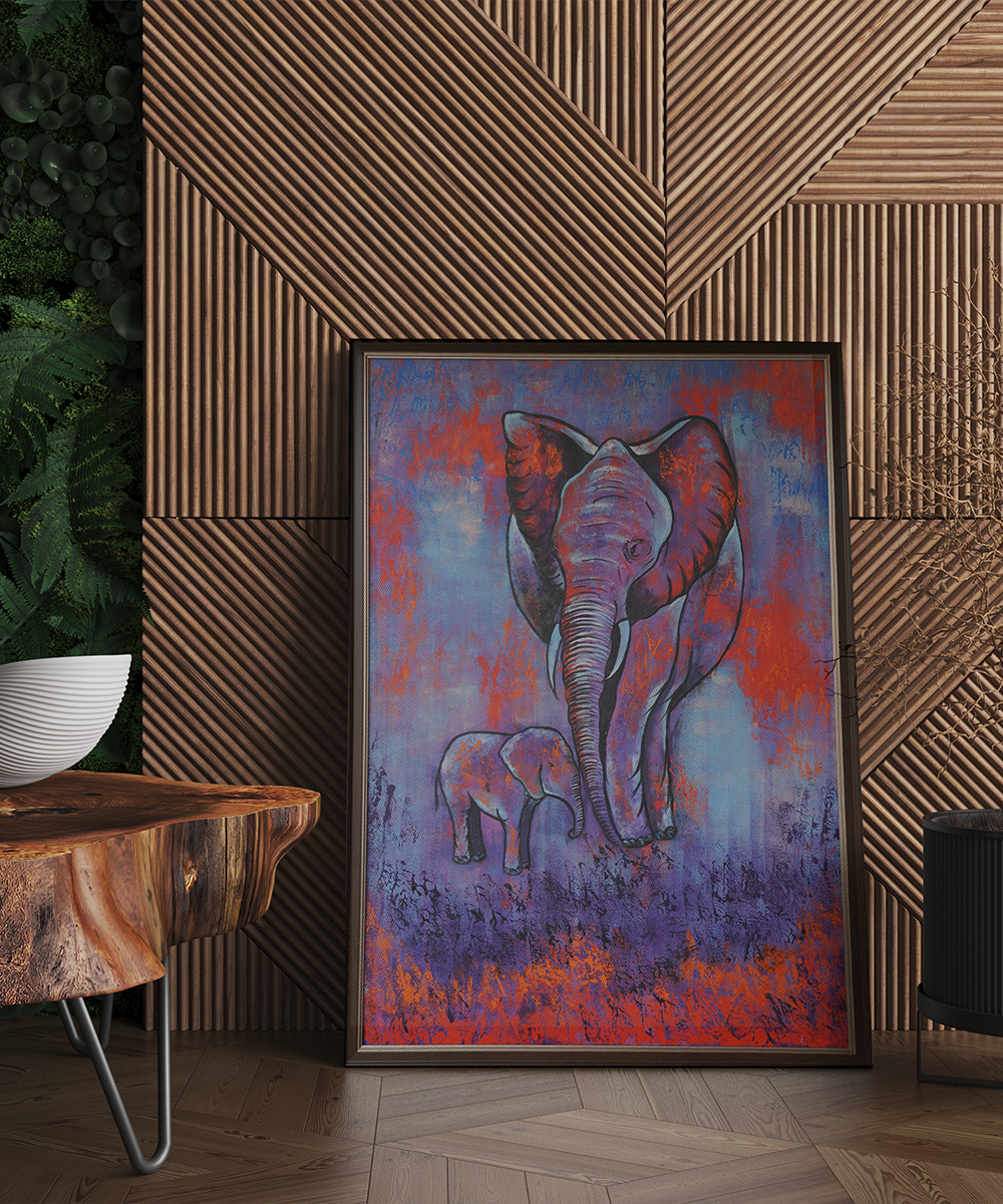 "Crimson Kinship" portrays the majestic elephants against a vivid backdrop of crimson and blues, capturing their deep familial bonds and resilience. This artwork symbolizes the connection between nature and humanity, using color to evoke a sense of emotional depth and the nobility of these gentle giants. It invites viewers to reflect on unity, protection, and care, blending the wild with the mystical.