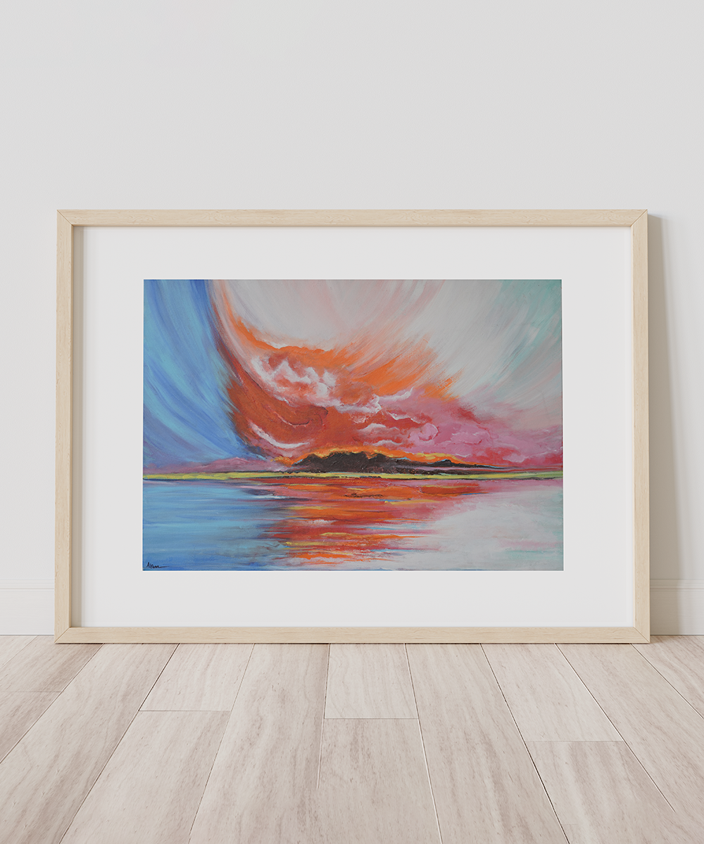 "Crimson Whisper" embodies the delicate interplay between the evening's glow and the gentle caress of water. With skillful brushstrokes, the artist captures a sunset ablaze, its reflection in the water crafting a scene of tranquil beauty. This painting is more than a visual feast; it's a moment of introspection, offering tales of passion and peace with every look.