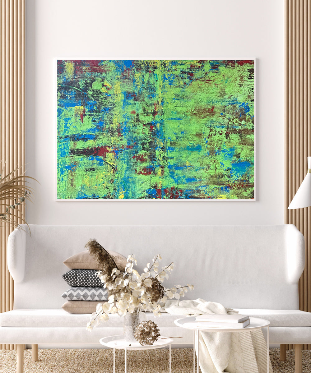 This canvas is a celebration of nature's diverse palette, a vibrant mosaic of greens and blues with hints of red and yellow peeking through, reminiscent of a lush forest in full bloom. The abstract composition invites the viewer to get lost in its complexity, echoing the chaotic yet harmonious beauty of the wild.