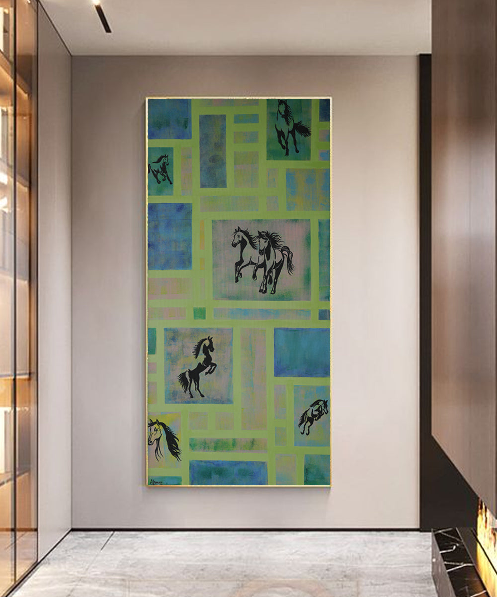 A fresh, cool palette of dawn paints the backdrop for the spirited dance of equine figures in this artwork. The serene blues and lively greens set a contrast to the dynamic movement of the horses, framing their free-spirited essence within a dawn-inspired spectrum of colour and light.
