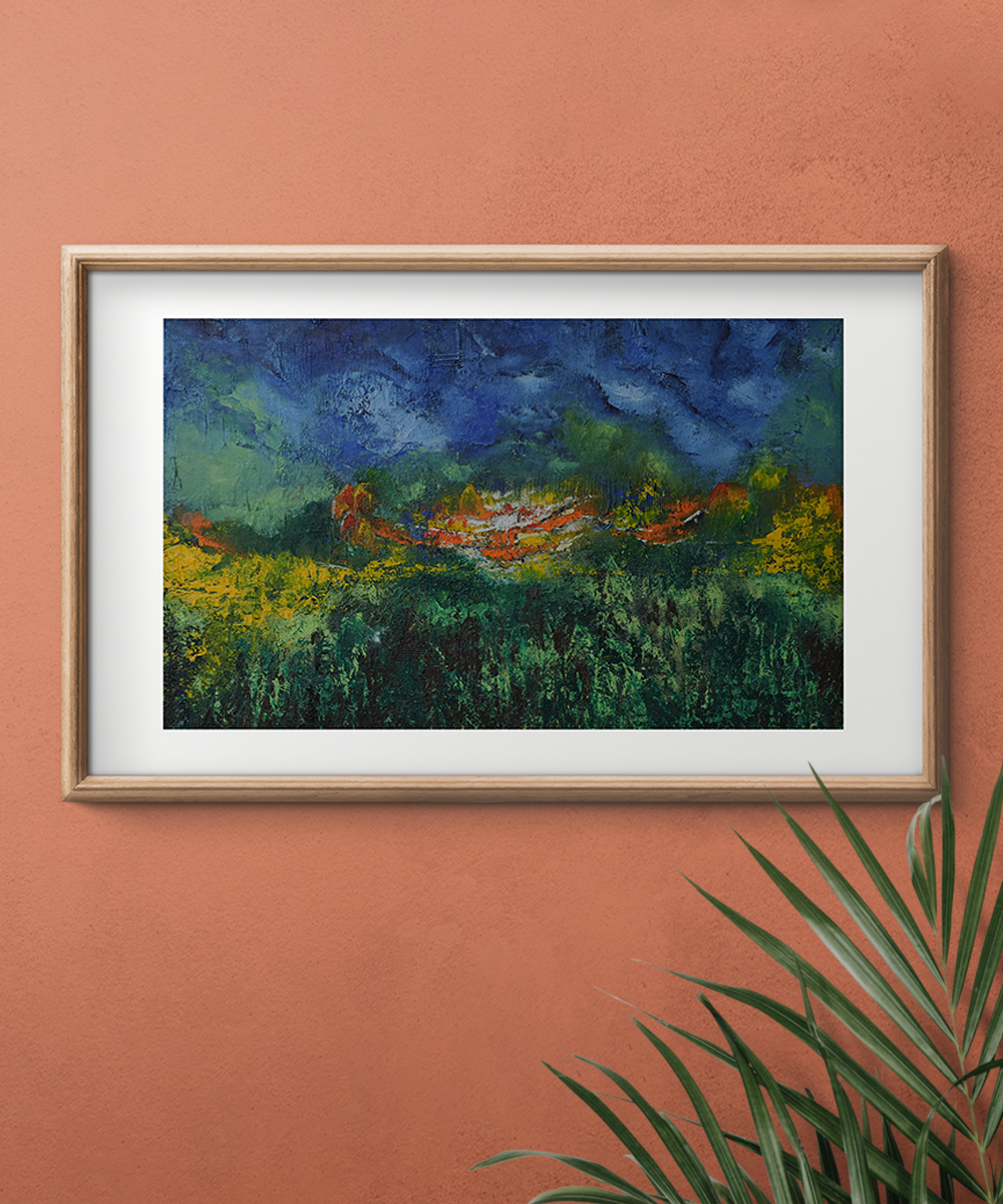 "Nature's Embrace" transports you into the wilderness, capturing the vibrant and untamed spirit of nature. With a palette of deep greens and earthy tones, the painting pulses with the life force of the wild, making nature's essence palpable. Light and shadow dance across the canvas, creating a landscape that's alive and constantly evolving, each brushstroke narrating tales of growth and resilience.