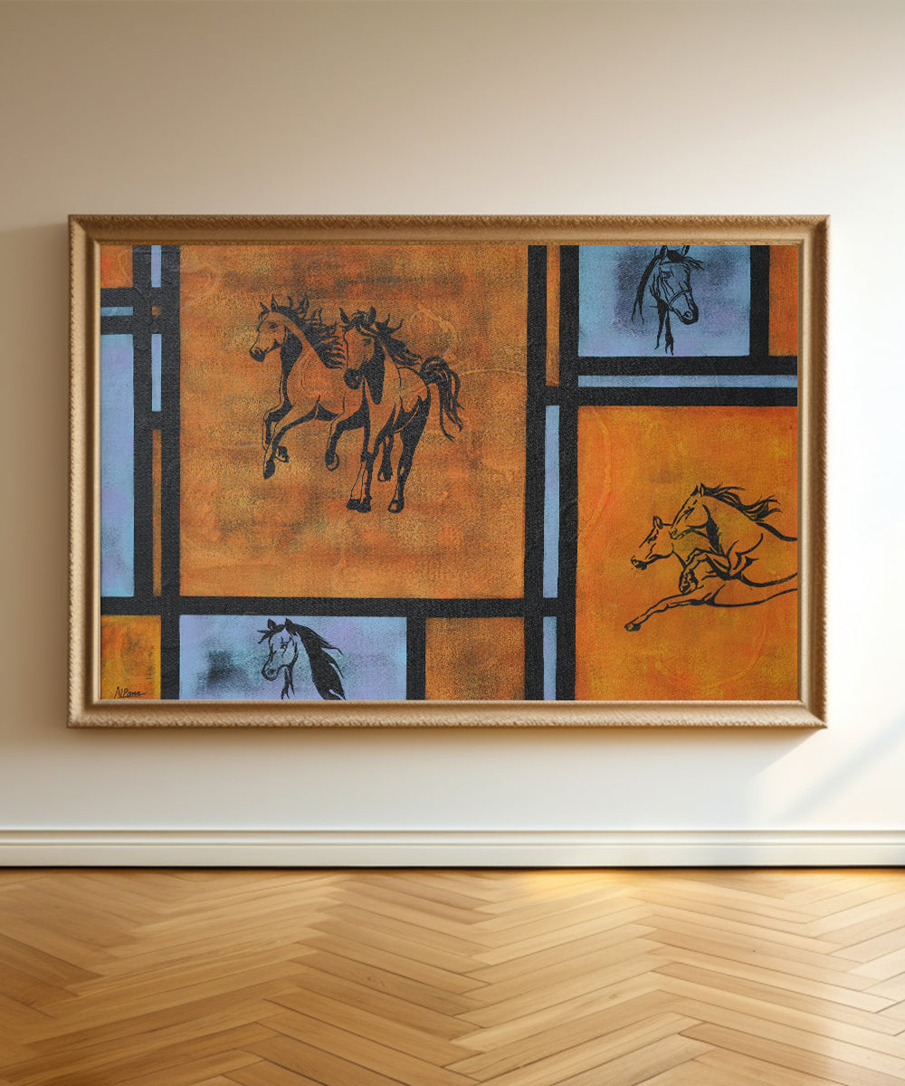 The warm hues of a setting sun envelop galloping silhouettes in this captivating painting, where the energy of wild horses is juxtaposed against a backdrop of vibrant geometric abstraction. Oranges and blues create a dynamic tableau, a visual symphony that celebrates the vigour of these majestic creatures.